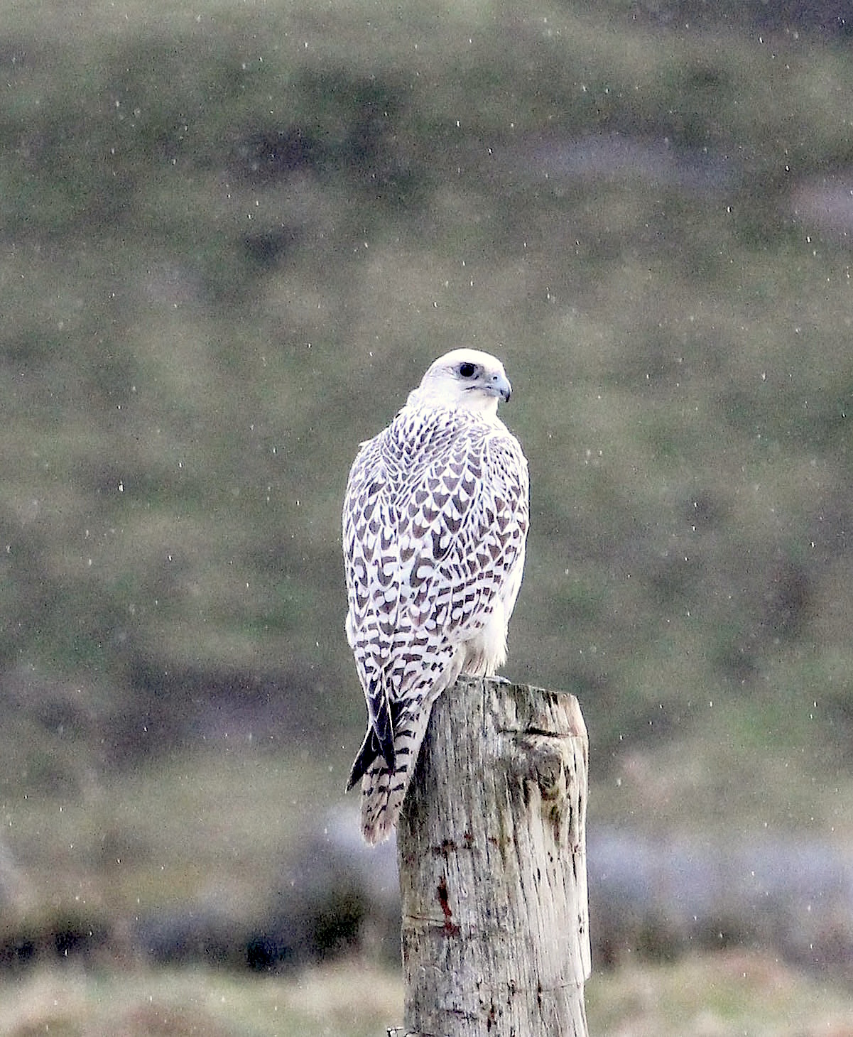 Some three and a half years after seeing a magnificent white morph Gyr in Greenland (see post for Oct 12th 2012) I finally got one for my Scottish list! It took a lot of work including a 3 day dip last January and several more hours during another Barra dip for the American herring gull. Perseverance eventually paid off last week - after another slightly shaky start. The bird had been 'showing well'- a phrase I have often come to dread and upon arrival an hour or so was spent around Balranald, checking fenceposts and rocky hillocks to no avail. The all too familiar 'dip' aura seemed to fill the air so we drove a circuit back to the main road and around the minor road to Hougarry. Suddenly a heavy, broad-winged, white bird, flapped lazily across the road some 100 metres or so in front of us and landed on a post, splaying its barred tail and wings. Someone muttered 'whats that!' and I replied 'thats the bird'! as I immediately recognised the in-flight jizz from my Greenlandic encounters. Imagine that- a tick-able Gyr from the car!! Well as expected there were a few moments of chaos as I put the car on a verge and we quickly got views and record shots from hastily snatched cameras. The bird was aware of us but seemed reluctant to move on, so better photos were obtained, scopes were set up and after much swearing and gasping we eventually settled down to enjoy crippling views of what is certainly the best bird I have ever seen. Another car coming the other way stopped so close to the bird that we were amazed it did not fly off, but later the driver explained that the bird was perched some 5 metres or so from a swan carcass that it habitually visited to feed. We decided that it was then prudent to move on to allow the bird to feed so headed for our accommodation to have a wee drink in celebration.